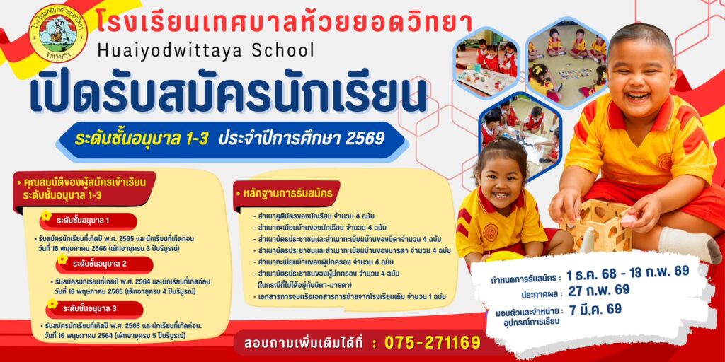 #โรงเรียนเทศบาลห้วยยอดวิทยา#เปิดรับสมัครนักเรียน#อนุบาล#ปีการศึกษา2569#ห้วยยอด#ตรัง
